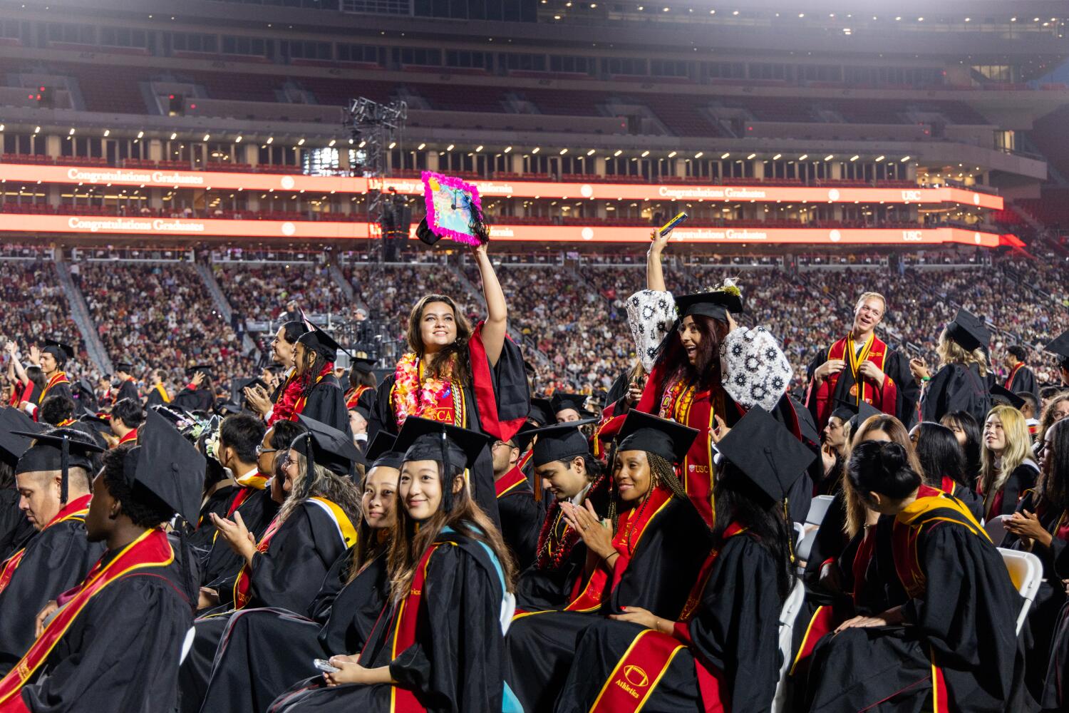 USC는 졸업식을 캘리포니아 콜리세움에서 개최하여 수십 년간 캠퍼스의 잎이 우거진 중심에서 펼쳐진식의 전통을 떠나는 동안 드론 쇼로 새로운 시작을 알렸다.