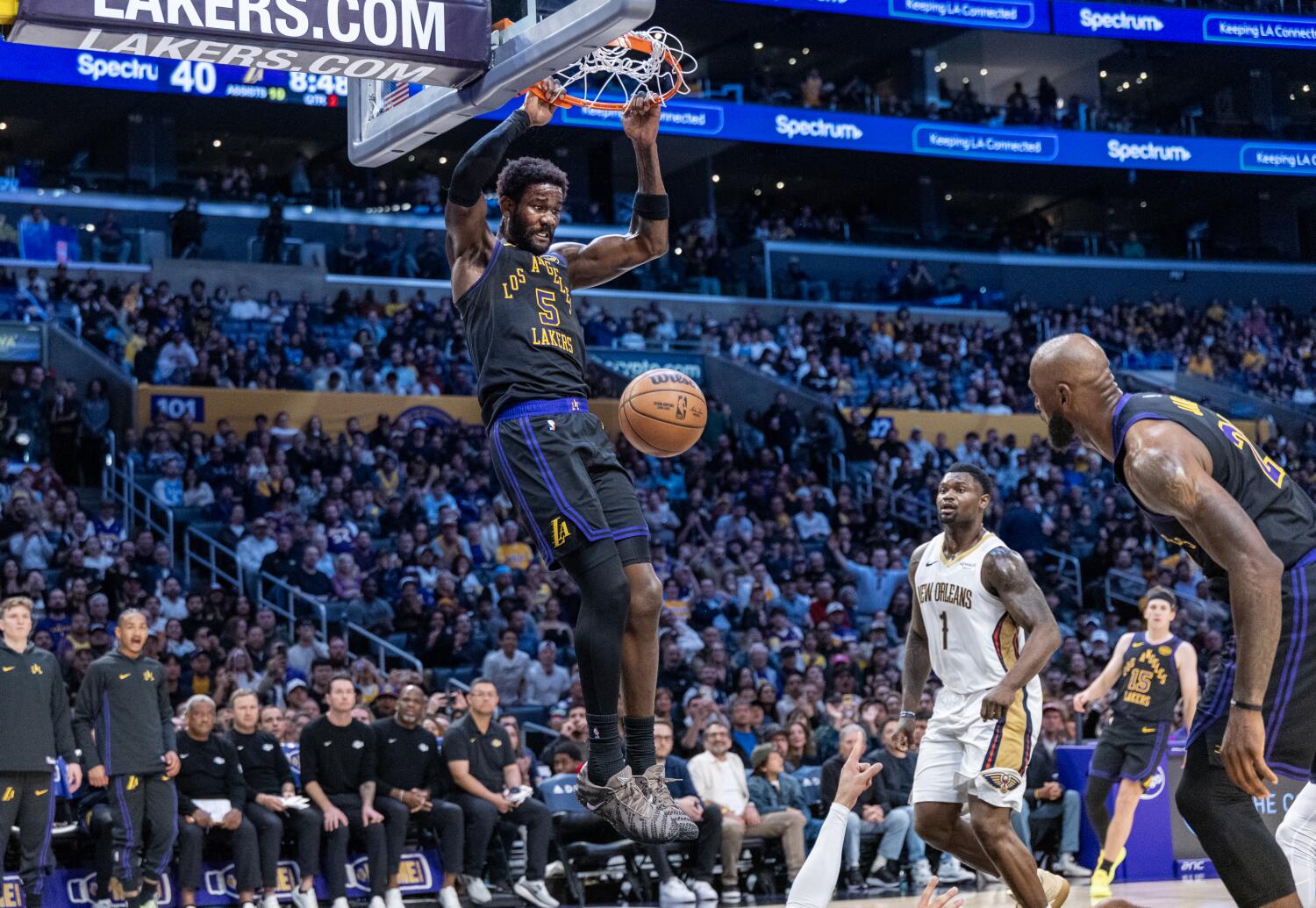 레이커스는 모든 다섯 선발 선수가 더블피겐스를 기록하며, 고집 센 펠리컨스 팀을 꺾고 승리를 거뒀다.
