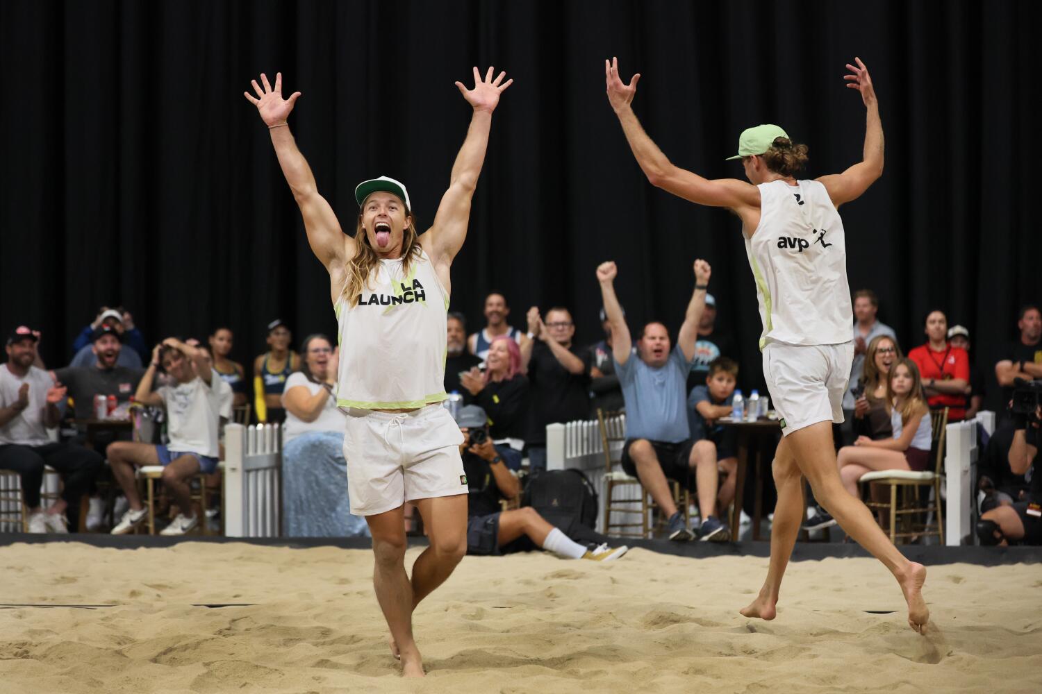 UCLA 축구 스타 신진 스미스가 토요일 밤 인투잇 돔에서 열린 AVP 리그 경기에서 아들인 L.A. 런치의 하겐 스미스를 응원하며 밀리미터 차이의 승리를 이끌어냈다.
