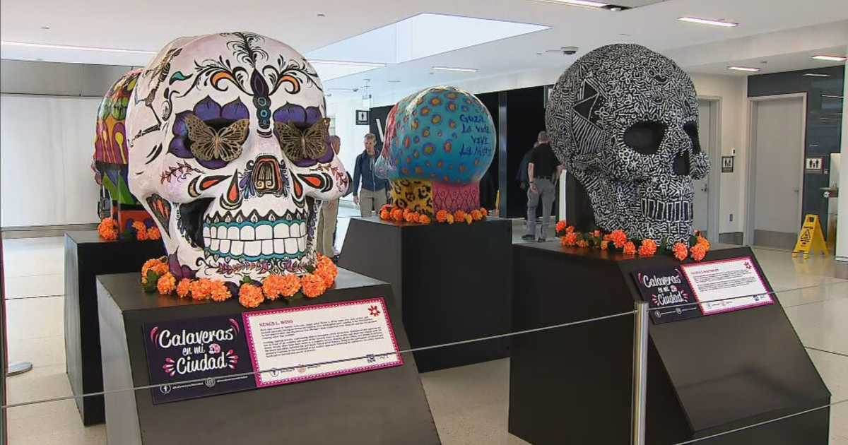 덴버 국제공항에서 열리는 예술 전시회는 사랑을 잃은 사람들을 기리는 파피에-마슈 해골들로 장식되어 있습니다.