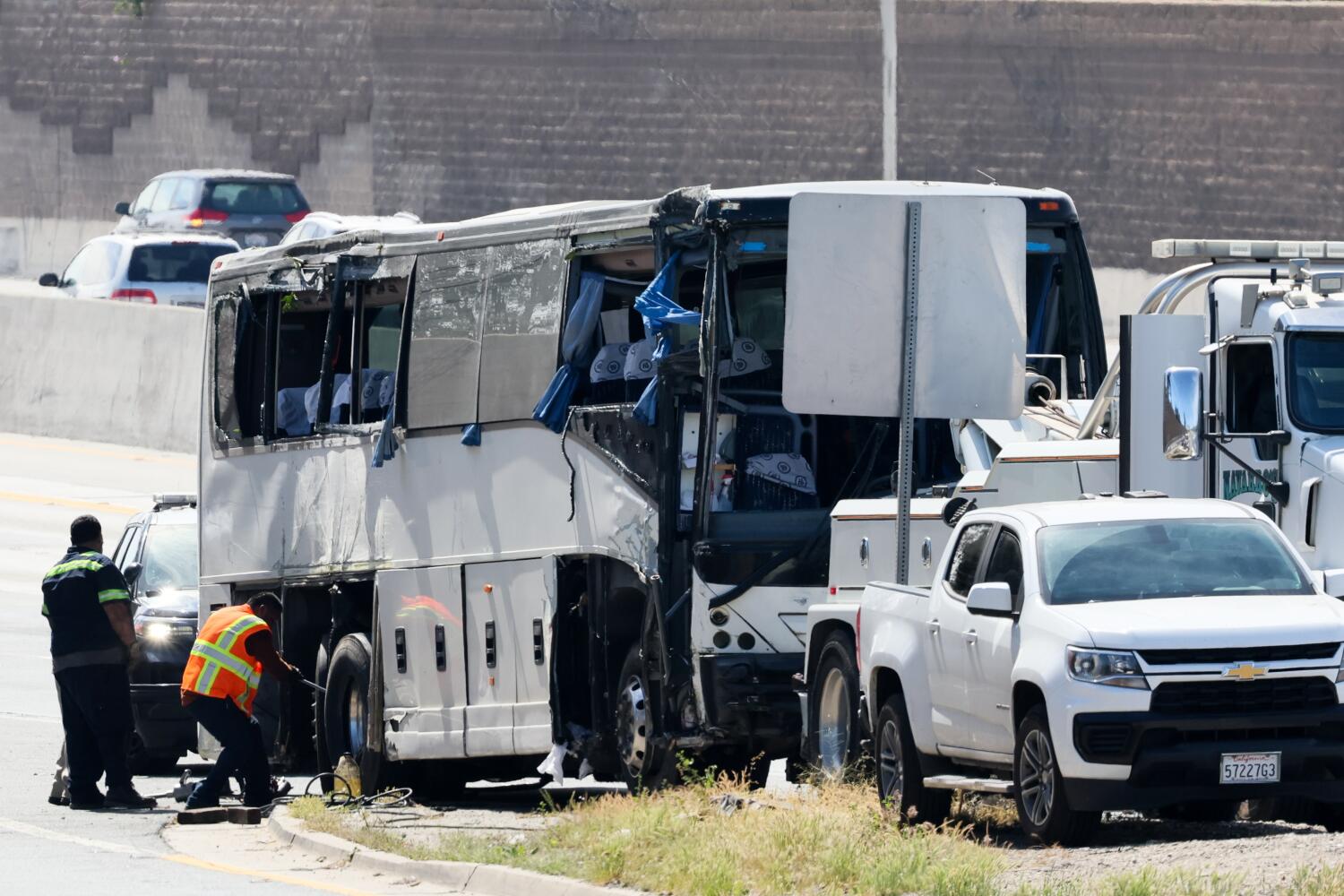 일요일 아침 로스엔젤레스 고속도로에서 만석인 관광 버스와 SUV 간의 화재 사고로 적어도 한 명이 사망하고 32명이 부상을 입었습니다.